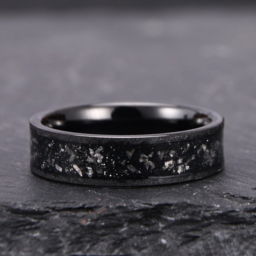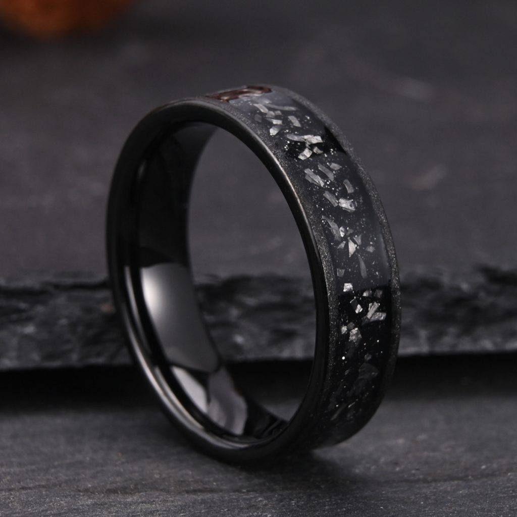 Couple ring tungsten steel inlaid with meteorite sheet black sandblasted