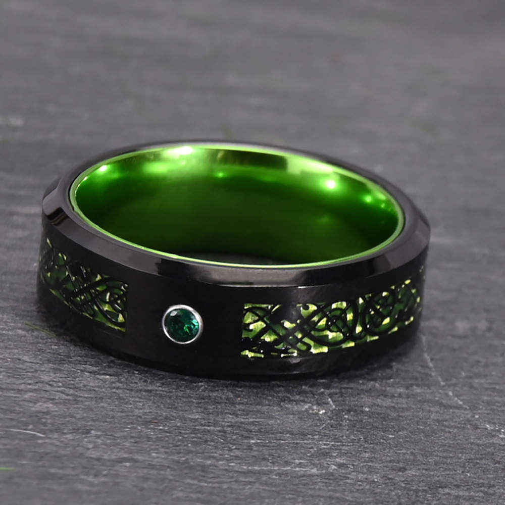 Black Tungsten & Aluminum Combination Ring: Domed Design with Diamond-Accented Green Aluminum Inlay